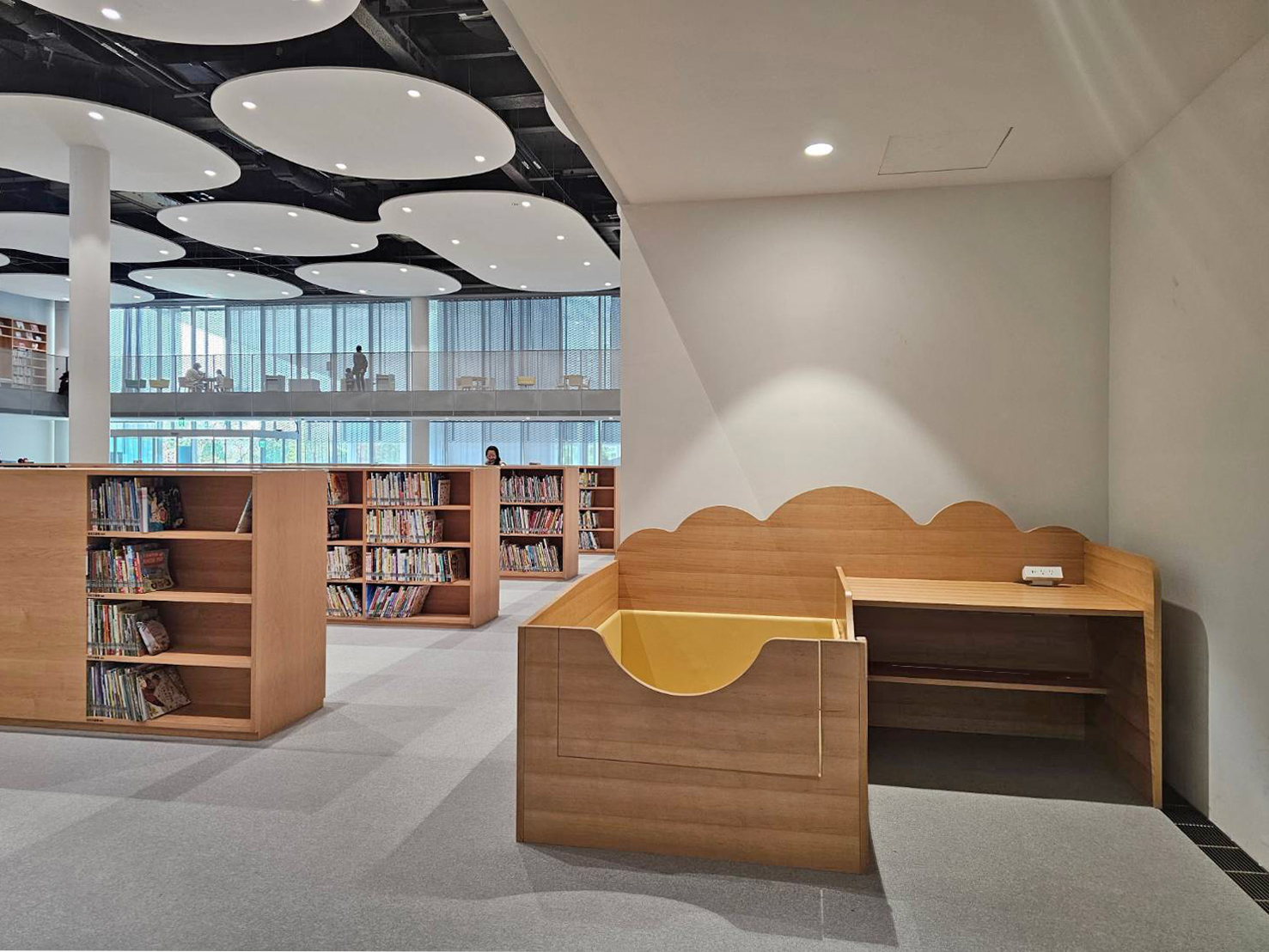建築大師妹島和世在臺第一個作品臺中[綠美圖],一共8棟建築物其中H棟行政大樓,圖書館部門辦公室及其他區域公共空間家具,文化局圖書自辦有利標評選,元皿家具以呼應建築外觀設計,輕盈.漂浮.曲線為設計主要概念,提供優質的家具有利標競賽第1名