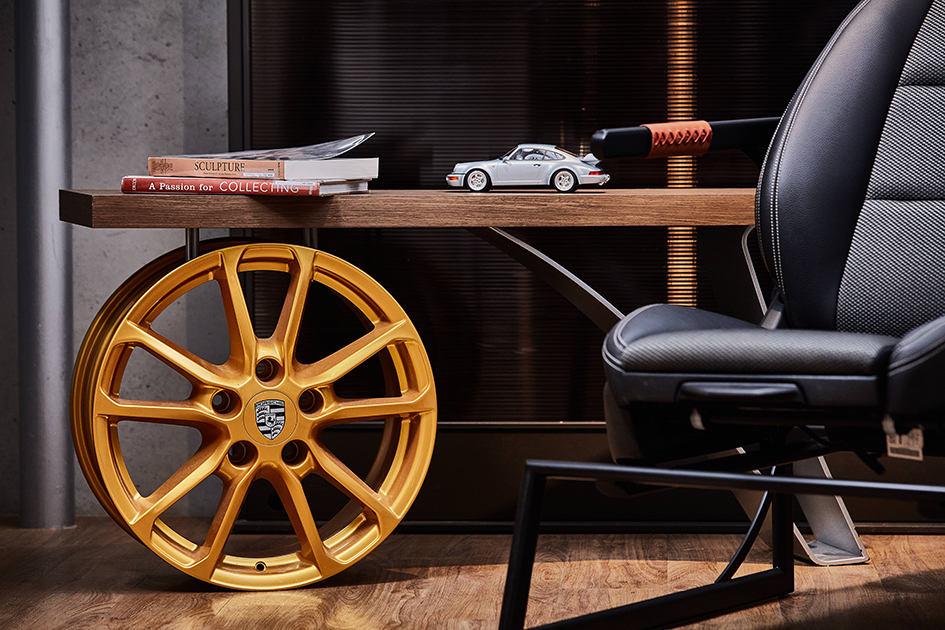 坐擁,好運滾滾而來 路上急速轉動的保時捷18吋輪框,吸引了我們的目光卻絕塵而去。於是 我們將輪圈輔以多層金色烤漆,配上蓄勢待發的流線型金屬桌腳,成為 家中最閃耀的光芒。 金屬桌腳的拋物弧線,彷彿一顆渴望突破的心,凝縮所有能量於光芒萬 丈的輪框,只待時機來臨,就能隨著急速滾動的光芒,開創全新的契機