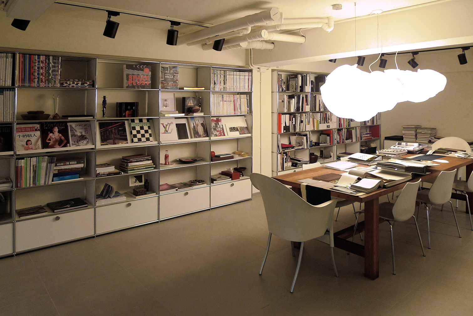 不同於一般辦公室,微型美術館似的室內設計公司是其主要亮點, 其中使用鋁質實心桌腳異向斜撐於桌板,穩重又簡潔。包含桌面上的屏風到頂天立地的展示分隔牆面,均用鋁柱模組化搭配多樣面材塑造辦公室的新型態。