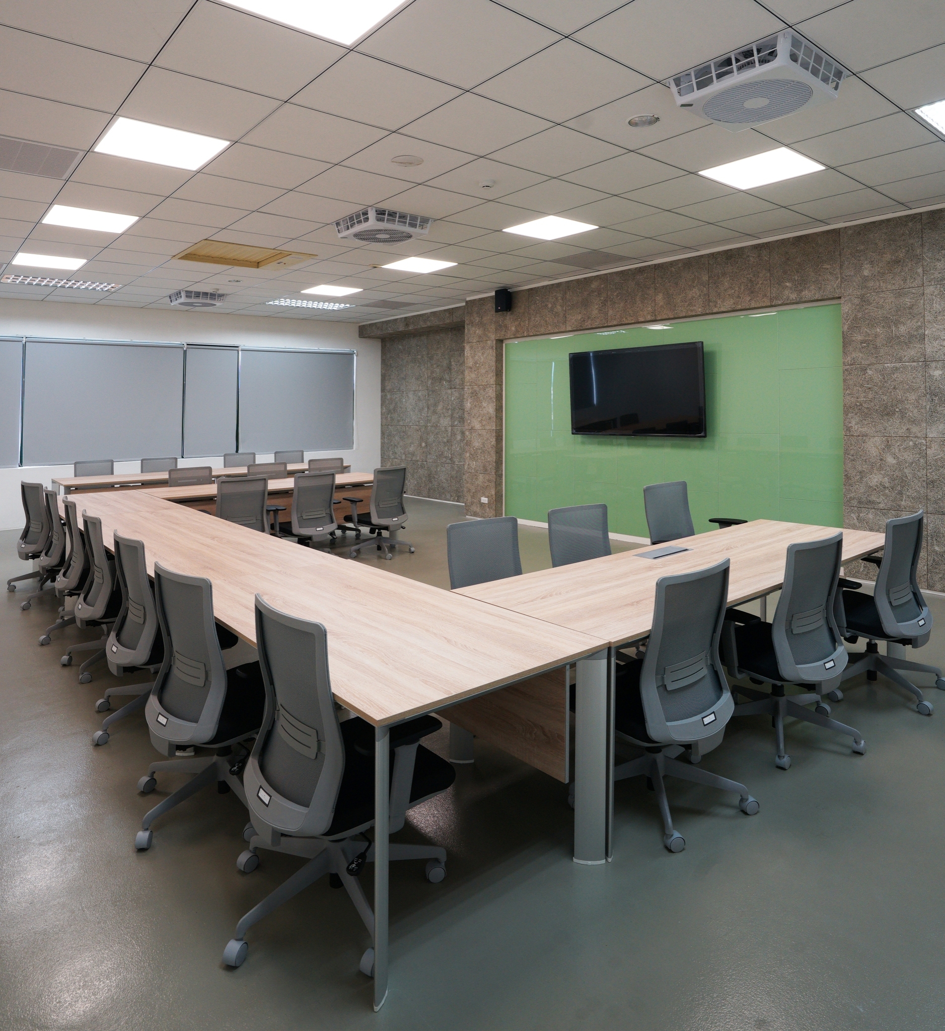 位於纖維博物館核心討論空間,用金屬搭配環保木質板規劃出一個優雅舒服的環境,具收納、會議、展示、屏障效果,多功多用。