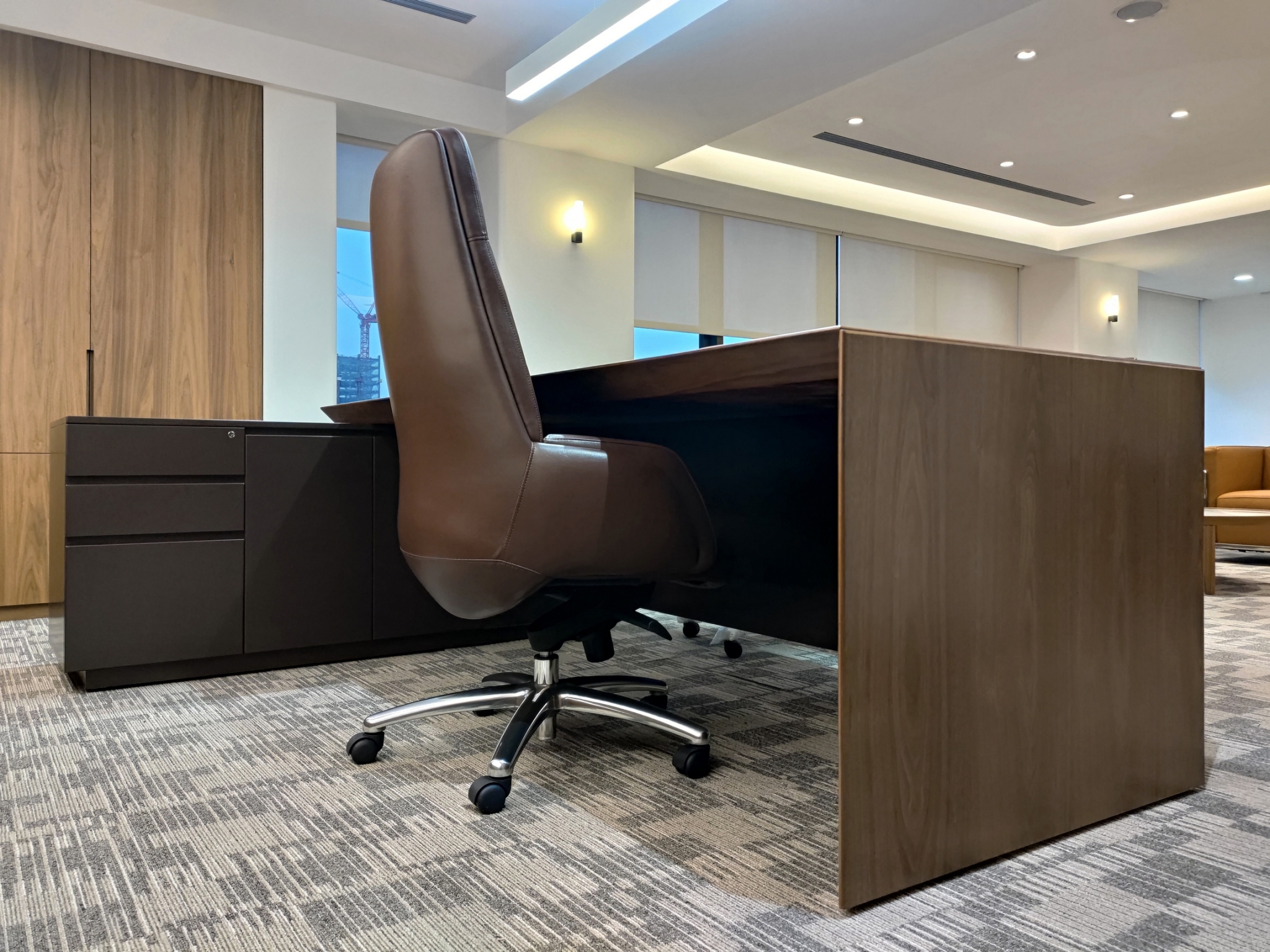 員工獨立工作環境包含通透且可吸磁記事屏風、弧狀外殼三抽袖箱櫃,充足的大L型桌面,整體空間既隱私又實用。